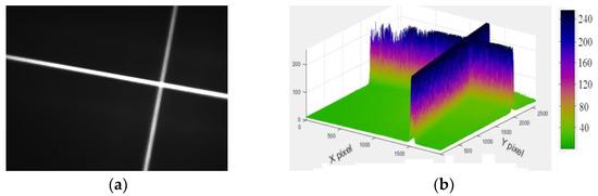 There are two forms of cross laser, as shown in Figure 1a, it is formed of a single point light source. The laser beam emitted by the laser source propagates along the Z direction, and all light is divided into two perpendicular planes by refraction of the shaping lens. The intersection line between the two planes and the imaging plane is cross-shaped, that are distributed along the X and Y directions, respectively [6]; Figure 1b shows the other form. The laser beams emitted by two laser sources form two planes through the refraction of the shaping lens, and the cross laser is formed when the two planes are perpendicular. The propagation direction of the two planes is Z, and the two beams are distributed along the X and Y directions, respectively.