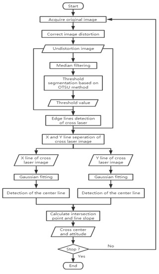 Therefore, the equations of the central lines of X and Y axis line of the cross laser can be obtained separately. The coordinate of the intersection point of the two center lines is the coordinate of the center point of the cross laser-pattern. Besides, with the slopes of the two center lines, the angles of X and Y axis laser lines of cross laser-pattern in camera image coordinate can be obtained, namely the attitude information of the cross laser can be determined.