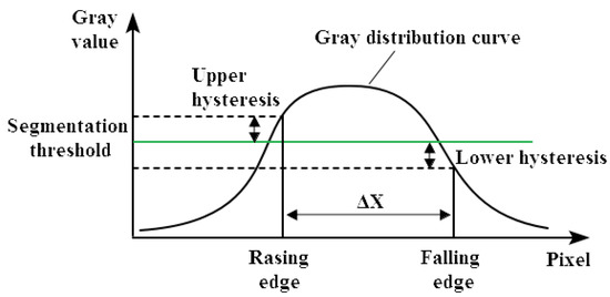 As shown in the Figure 7, the gray value curve of the image in the horizontal pixel direction is presented, here the segmentation threshold is the one that obtained by the maximum inter-class variance method mentioned above. In order to eliminate noise interference, a hysteresis is set on the basis of segmentation threshold. When the gray value of the searched pixel is greater than or equal to “ideal threshold plus hysteresis” and the gray value of the previous pixel is less than that pixel, the point is designated as the rising edge in that searching direction. When the gray value of the searched pixel is less than or equal to “ideal threshold minus hysteresis” and the gray value of the previous pixel is greater than that pixel, the point is designated as the falling edge in that searching direction.