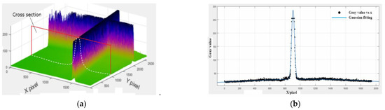 (a) Cross section of the cross laser pattern. (b) The gray distribution in the cross section accords with Gaussian model.