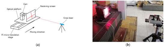 Since the center coordinates in theory of the cross laser-pattern cannot be obtained directly, the horizontal displacement measurement experiment was conducted to verify the positioning accuracy of the cross center indirectly. The image acquisition system was placed on a PI micro translation platform, and the accuracy of the translation platform is ±1 μm. The experimental schematic diagram and the experimental process diagram are shown in Figure 14.
