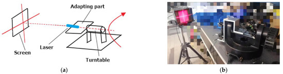 Before the experiment, the cross laser is fixed to a high precision turntable with adapting part, the accuracy of the turntable is ±3”, and to ensure the laser projection axis was coaxial with the turntable axis, the laser position is adjusted. That is, the center of cross laser image does not change in the image coordinate when rotating the turntable. The measurement principle is shown in Figure 18.