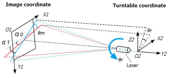 In order to express conveniently, the cross laser only draws the X axis laser line. Here, is angle of the laser line at the initial moment in the image coordinate system and is the angle of laser line in the image coordinate system after rotation. represents the rotation angle measured by the image acquisition system and represents reference value of the rotation angle obtained from the turntable system. Since the projection axis of cross laser cannot be guaranteed to be perpendicular to the receiving screen of the image acquisition system, the projection error will be introduced into the measurement [26], and represents the measurement error. The correlation is shown in Table 2: