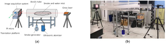 (a) Experimental schematic diagram. (b) Experiment procedure picture under smoke and water mist environment.
