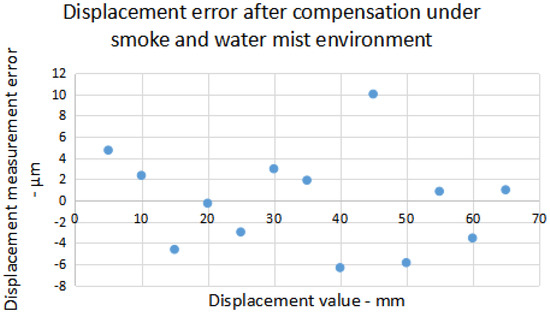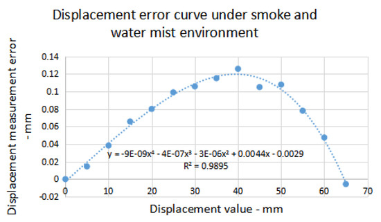 During the experiment, there was smoke and water mist in the light path of the cross laser-pattern. The cross laser was fixed as the measurement datum, and the PI micro translation platform moved at an interval of 5 mm as the reference displacement value. With the proposed measurement algorithm and the calibrated conversion coefficient, the related displacement can be measured. The relationship between measurement error and displacement value is shown as follows:
