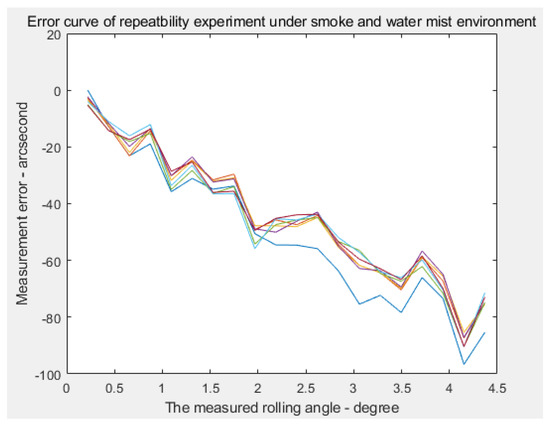 In this experiment, the image acquisition system was placed on an electrical turntable with an accuracy of ±4″. The cross laser-pattern was fixed as the measurement datum. The image acquisition system was rotated by the electrical turntable along the projection direction of the cross laser. With the proposed method, the measured rolling angles were obtained under the smoke and water mist environment, and the reference rolling angle values were obtained from the electrical turntable controlling software.