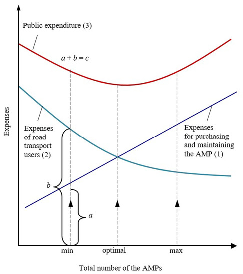 The number of AMPs nationwide correlates with the required and actual amount of asphalt mixture produced by the country in question. The larger the area and population of the country, the better developed the road transport infrastructure, the higher the geometric parameters for roads and city streets, the more enhanced the quality of their asphalt pavement and the more asphalt mixture needs to be produced. Thus, growth in the required amount of asphalt mixture increases the number of AMPs across the country. The developed cost model (Figure 2) shows that as the number of AMPs grows, the expenses of purchasing and maintaining those AMPs increase as well. It also results in a decrease in the costs for the road users. Many AMPs can produce a large amount of the asphalt mixture used for improving the quality of the road transport infrastructure. A proper condition of the asphalt pavement and the type of pavement introduced on gravel roads reduce the transportation costs, environmental air pollution and road accidents.