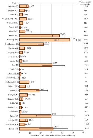 - The research has shown that the differences between the minimum and maximum annual amounts of asphalt mixture produced and the differences between the average annual numbers of the operating asphalt mixing plants in different European countries are very high. Based on the significant difference, asphalt mixture production across the 30 European countries was categorized into five categories: (1) very large quantities (from 30 to 50 million tonnes, four countries in Europe); (2) large quantities (from 15 to 30 million tonnes, three countries); (3) average quantities (from 5 to 15 million tonnes, nine countries); (4) small quantities (from 2 to 5 million tonnes, seven countries); and (5) minimal quantities (from 0.25 to 2 million tonnes, seven countries). The average annual minimum number of asphalt mixing plants in operation in these countries was 4.2 (Luxembourg) and the highest average number was 652.2 (Italy).