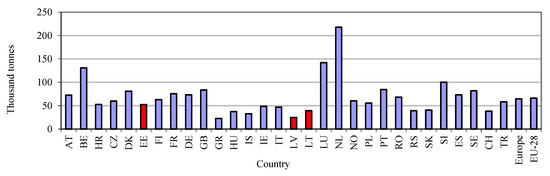 During further analysis, while taking into consideration the annual average mixture value () produced by the AMPs for the period 2005–2016, all European countries have been categorized into five categories (Table 1). The threshold values of the produced asphalt values for each of the categories were selected based on the results provided in Figure 3 and Figure 4. It must be noted that, in order to categorize the countries into different categories more precisely, the ranges of the threshold values in each of the categories are not equal. As the amount of the produced asphalt mixture increases, the range of the threshold values also increases. Correspondingly, as the amount of the produced asphalt mixture decreases, so does the range of the threshold values. Thus, a very large amount (from 30 to 50 million tonnes) of the asphalt mixture was produced in four countries, a large quantity (from 15 to 30 million tonnes) in three countries, an average quantity (from 5 to 15 million tonnes) in nine countries, a small quantity (from 2 to 5 million tonnes) in seven countries and a minimal quantity (from 0.25 to 2 million tonnes) in seven countries (Table 1).