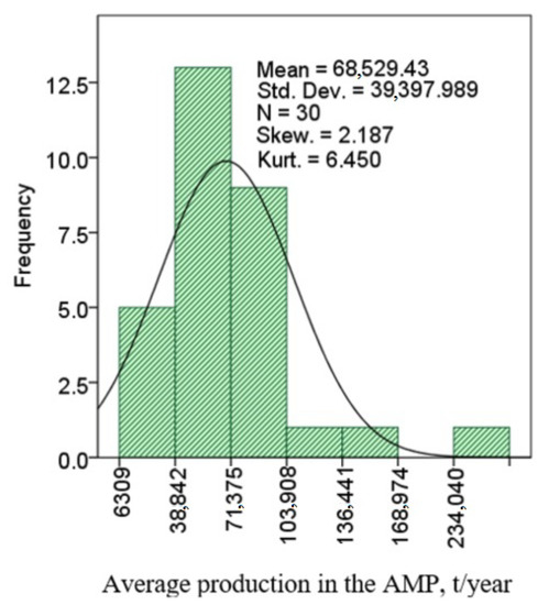 For the 30 European countries, one AMP produces on average 68,530 tonnes of HMA and WMA mixtures a year. The standard deviation from the actual MC of an AMP is equal to approximately 39,400 t/year (Figure 6). The coefficient of variation CoV = 57.5% indicates that the distribution of the actual MC of the AMPs in individual European countries is not normal because CoV > 33%. When the modules ǀskǀ and ǀkuǀ of skewness and kurtosis are calculated from the averages of the actual mixing capacity () of the AMPs in 30 countries, which are smaller than the values of ssk and sku multiplied by 3 and 5, it can be reasonably considered that the experimental data are distributed according to the Gaussian distribution. The values ssk and sku of the standard deviations are subject only to the sample size and are calculated according to the formulas given in [49]. While taking into consideration the sample of the 30 countries, the coefficients 3ssk = 1.28 and 5sku = 4.26 are smaller than ǀskǀ = 2.189 and ǀkuǀ = 6.450. A result such as this indicates that the distribution of the actual MC of the AMPs in individual countries is not normal.