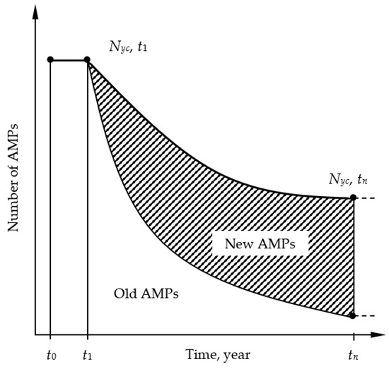 The economies of the Western European countries have allowed for the rapid implementation of scientific and technical progress in road building. As a result, the increasing demand for high-quality asphalt mixtures and environmental protection has forced the AMP designers and manufacturers to be ready to supply the technological equipment which would meet these requirements. As for the Eastern European countries, and the Baltic States in particular, before the restoration of independence in 1990 and the following decade, the old generation AMPs had still been operating. The dynamics of renewing the AMPs’ fleet (Figure 7) shows that, over time, the ratio of the number of the new to old AMPs has gradually increased (from t1) in the Baltic States, and the total number has decreased (to tn) due to the purchasing of modern equipment of a significantly higher MC. This qualitative breakthrough has made it possible to significantly improve the AMPs’ fleet, which has come close to the requirements raised by other European countries according to the technical indicators.