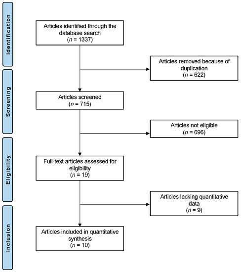 The literature search resulted in 1337 articles. Of them, 622 were duplicates. A further 696 articles were excluded as they did not match our eligibility criteria: study design (N = 387), not matching the topic (N = 267), not focusing on knee (N = 21), discharge within one or two postoperative days (N = 11), uncertain results (N = 4), other (N = 4), language limitations (N = 2). Another 9 articles were excluded as they did not report quantitative data under the outcomes of interest. This left 10 studies for inclusion. The literature search results are shown in Figure 1.