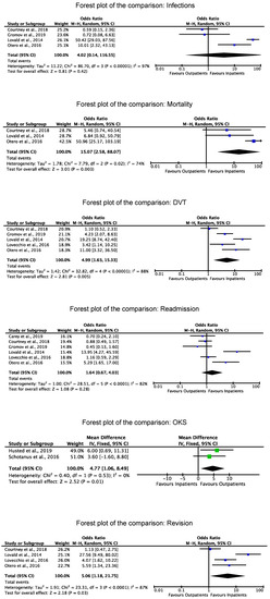 The outpatient group evidenced a greater OKS (MD 4.77; 95%CI 1.06 to 8.49; p = 0.01). The inpatient group demonstrated a greater rate of revision (OR 5.06; 95%CI 1.18 to 21.75; p = 0.03), mortality (OR 15.07; 95%CI 2.58 to 88.07; p = 0.003), and DVT (OR 4.99; 95%CI 1.63 to 15.33; p = 0.005). No difference was found in the rate of readmission (p = 0.3) and infection (p = 0.4). The forest plot of each endpoint is shown in Figure 3.