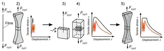 As weight-reduced UHPFRC structures are more susceptible to fatigue, the performance of micro steel fibres under cyclic loading has to be considered additionally. Here, the occurrence of the desired fibre pullout is not entirely clear yet. Makita [12] assumed that cyclic loading causes fibre pullout under the top load and slips back into the concrete channel by elastic rebound under the bottom load. The cyclic pulling out and slipping back abrades the fibre’s surface. After a certain number of load cycles, the abrasion progresses so far, and there is no longer any “bond”; thus, the fibres pull out of the concrete matrix. Furthermore, it might also be possible that a so-called “tribocorrosion” (the combination of wear and corrosion) of fibres in the crack area occurs. This combination might lead to a faster decreasing cross-sectional area of the fibre, and an unexpected material failure might happen.