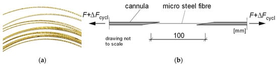Due to the steel’s fibre filigree character (0.19 mm and 0.13 mm) and the short length (13 mm and 6 mm), it was challenging to perform the tensile tests, especially for cyclic loading. In terms of pilot tests, clamping the bare steel fibre directly into the jaws of a testing machine led to high transverse pressure on the fibre’s surface. The clamping jaws damaged the fibre considerably, and a following examination of the surface near the crack area was no longer possible. Therefore, gluing the uncut (raw) material of the steel fibre with a length of 300 mm into the (medical) cannulas at both ends was performed. Figure 2 shows the raw material of the steel fibre (a) and the test specimen for the monotonic and cyclic loaded tensile tests (b). The length between the cannulas (test length) was 100 mm. A precision testing machine with a 500 N load cell ran the test execution of all tests and its transducer measured the displacement of the fibre.