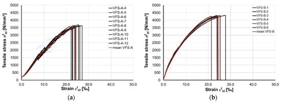 Tensile stress–strain curves of high-strength micro steel fibres of test series VFS-A (a) and VFS-B (b).