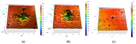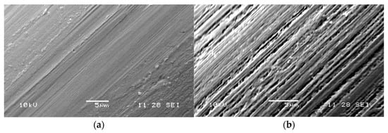 The steel fibre’s surface (VFS-A) with brass coating in Figure 4a is quite smooth. Only some faults are noticeable on the surface with a very slight depth. In contrast to that, the fibre’s surface without brass coating in Figure 4b shows many gouges located mostly in the longitudinal direction of the fibre. The production process might have caused these gouges and the brass coating hides them underneath.