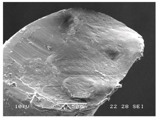 As the cross-sectional area is very important for the calculation of the tensile strength of the micro steel fibre, accurate determination of the gouge’s depth was attempted in additional SEM investigations. Instead of the micro steel fibre’s surface, the cross-sectional area should reveal the depth of the gouges. The fibre had to be located parallel to the electron beam for visualization. Nevertheless, a steel fibre located in the electron beam’s direction works like an antenna. The detector might not collect all electrons and provide blurry pictures. This is why the steel fibre was orientated at an angle of approximately 45° to the electron beam. Figure 5 shows the image of the SEM with the cross-section of the fibre.