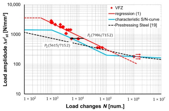 The test series VFZ-9 has not been included in the calculation so far. It shows three run-outs at a load amplitude of (cf. Table 3). Thus, the characteristic S/N curve (blue line in Figure 6) changes its direction and obtaines a reduced inclination and crosses the “run-outs”. The redirection of the S/N curve requires another regression to assign an equation. Equation (4) gives the formulae of the carried on S/N-curve for :