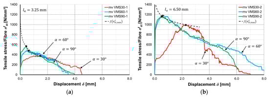 Figure 8 shows the pullout curves of fibre groups with an orientation of 30°, 60°, and 90° under monotonic loading (mean values = mv). The highest pullout resistance for an embedded length of 6.50 mm () is approximately 1175 N/mm2, which equals to nearly one-third of the tensile strength. All other pullout resistances show lower values. Additionally, the pullout resistance for an embedded length of 3.25 mm () does not correspond proportionally to 50% of the pullout resistance for an embedded length of 6.50 mm; the relation is approximately 40%. Due to the low utilization of the tensile strength of the fibre, there was always a systematic fibre pullout, i.e., no steel fibre broke.