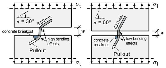 Low fibre orientation angles (e.g., 30°) result in higher bending effects than high angles of orientation (dashed line in Figure 8). Figure 9 visualizes the context of the bending effects at the exit point of the inclined fibres.