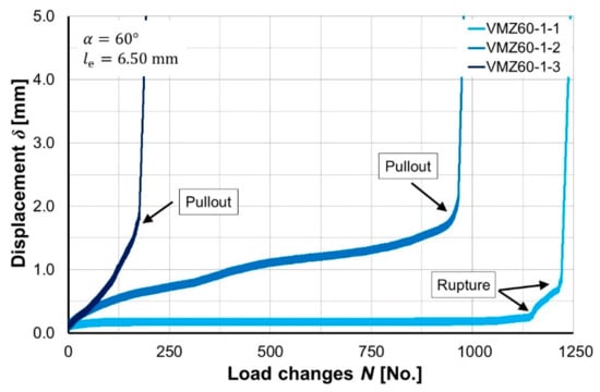 In the VMZ90 series, the test execution stopped unexpectedly after 1000 load cycles due to a defect of the test machine. For the VMZ60 series with an embedded length of and a fibre angle inclination of , Figure 11 shows the measured pullout displacement δ as a function of the applied load cycles . It can be concluded that the three typical phases of fatigue of concrete also apply to the pullout tests of embedded high-strength micro steel fibres in UHPC: