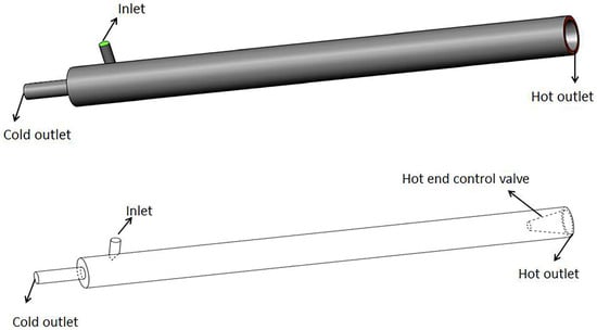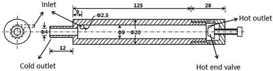 The actual physical model and detailed geometric parameters of the swirl flow pipe are shown in Figure 1. The size of the swirl flow pipe is 20 mm for the hot tube’s outer diameter, 2.5 mm for the inlet nozzle’s inner diameter, 4 mm for the cold tube’s inner diameter, 125 mm for the hot tube length, and 175 mm for the hot tube plus two kinds of a single nozzle.