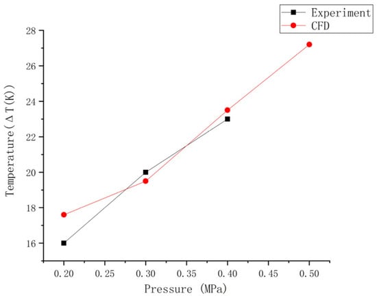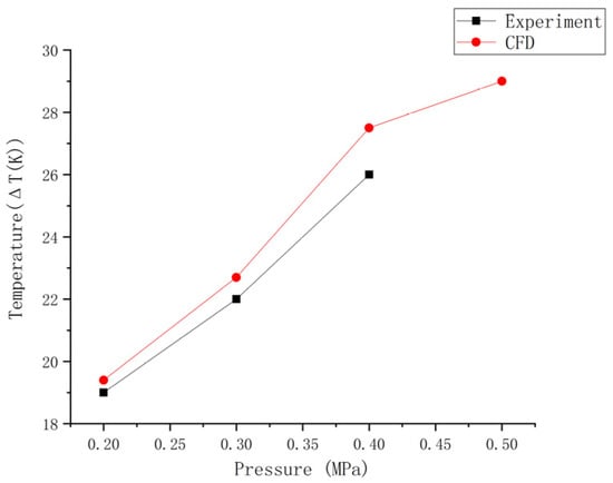 Figure 4 and Figure 5 show the CFD results for swirl flow pipes of length 125 mm and 175 mm at different initial pressures compared to the experimental results in []. The temperature difference at the outlet of the cold end, derived from experiments, is given by Agrawal in the study [], and it can be concluded from the data in Figure 4 and Figure 5 that the numerical simulation data obtained from the k-ε models of both swirl flow pipe models are accurate and close to the experimental data in []. Our results indicate that the standard k-ε model established in the numerical simulation (Section 2) accurately simulates the flow state in the experiment in [] and also yields the same results as the experimental data.