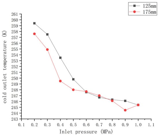 Figure 6 and Figure 7 show the effect of inlet pressure and hot-end tube length on hot and cold outlet temperature. The inlet temperature was set at 277 K. As the inlet pressure rose, the cooling outlet temperature declined continuously, reaching a minimum temperature of 245 K at 1 MPa, with a larger temperature drop from 0.2 to 0.6 MPa, and gradually leveling off at 0.6 to 1.0 MPa. In the comparison of two swirl flow pipes with lengths 125 and 175 mm, the cold end temperature of the 175 mm pipe (with the longer hot-end tube) was lower than that of the 125 mm swirl flow pipe (with the shorter hot-end tube). The hot-end outlet temperature increased more than that of the cold end outlet temperature. The inlet pressure of the swirl flow pipe is the driving force that makes the internal airflows rotate and separate. The effect of the inlet pressure is greater than the effect of the tube length on the cold outlet of the swirl flow pipe. As shown in Figure 6, the cold outlet temperature of the swirl flow pipe (with length 175 mm) reaches the lowest temperature point of 244.5 K at 0.9 MPa. Therefore, it can be concluded that there will be a minimum cold outlet temperature as the pressure gradually increases. As can also be seen in Figure 6, when the length of 175 mm swirl flow pipe at 0.9 MPa, the hot-end temperature will also fluctuate, after which the hot-end temperature continues to rise as the pressure increases.
