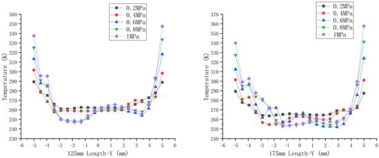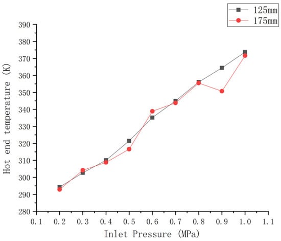 Figure 8 demonstrates the axial temperature at the center of the swirl flow pipe at different pressures for tube lengths of 125 and 175 mm. The principal locations for the separation of hot and cold streams in the swirl flow pipe are in the hot-end pipe area. The outer side of the tube wall distributes the hot airflow with high cyclonic velocity, and the core side distributes the cold airflow with low velocity. The inlet pressure affects the inlet velocity of the airflow, which in turn affects the separation of the hot and cold airflow in the swirl flow pipe. The current experimental research on swirl flow pipes is mainly reflected in the inlet pressure, and the temperature changes inside the swirl flow pipe are analyzed through numerical simulation results.