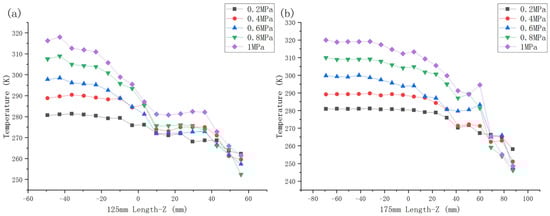 Effect of inlet pressure and hot-end tube length ((a), 125 mm swirl flow pipe. (b), 175 mm swirl flow pipe) on axial outlet temperature.