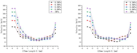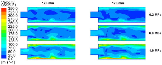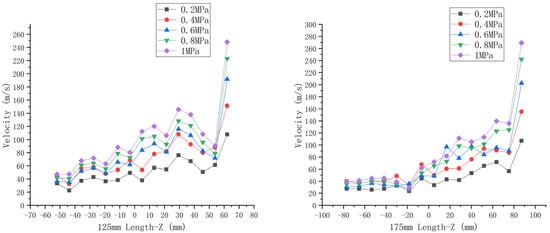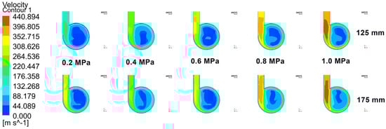 Figure 17 also shows that the tangential velocity increases from the center of the axis to the outer edge of the swirl flow pipe in the same axial section; the tangential velocity also rises gradually with increasing pressure, but the increment decreases. There are significant differences in the tangential velocity in different axial sections. Along the hot-end tube, the tangential velocity becomes progressively weaker due to the fluid pressure difference and kinetic energy loss. As the fluid enters the vortex chamber tangentially, the fluid flows tangentially along the outer edge, so the pressure at the outer edge is higher than the pressure in the axial region. At different axial cross-sections, the exchange of work, kinetic energy, and heat (during the flow process) result in a reduction in pressure and, therefore, a reduction in tangential velocity. Figure 18 indicates that the effect of swirl flow pipe length on radial velocity is smaller for the same inlet pressure, as seen in the three plots, where the velocity of the swirl flow pipe with a tube length of 175 mm is slightly higher than that of the swirl flow pipe with a tube length of 125 mm. This leads to the conclusion that it is the number of swirl flow pipe inlets and the vortex chamber diameter, rather than the length of the swirl flow pipe hot end, that affects the radial velocity of the vortex chamber.