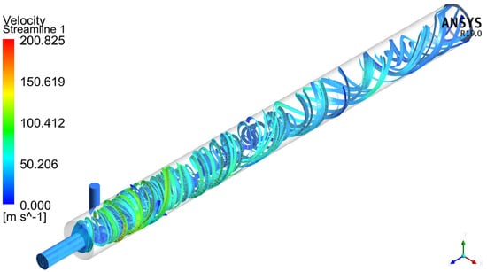 The compressed gas enters the vortex chamber tangentially from the swirl flow pipe inlet, the gas expansion performs work, and part of the pressure potential energy is converted into kinetic energy at the inlet. The kinetic energy forms a high-speed vortex flow in the pipe (Figure 10), increasing the temperature at the wall of the pipe, and produce a pressure gradient from the outer edge of the tube to the axial area. When the inlet pressure reaches 1 MPa, the inlet of the swirl flow pipe is depressurized, expanded, and accelerated to a critical state at the minimum cross-section. The depressurization continues to reach a supersonic state in the vortex chamber. From the numerical simulation results, it can be seen that the supersonic fluid will appear only when the pressure at the swirl flow pipe inlet is high enough. The pressure gradient between the hot-end valve and the vortex chamber is caused by the action of the hot-end valve, which in turn leads to backflow in the axial region. The high-speed airflow is in a cyclonic state while moving toward the hot-end valve, so the vortex phenomenon occurs in the swirl flow pipe (Figure 11). Figure 12 shows the distribution curve of the axial velocity of the swirl flow pipe. From Figure 12, it can be seen that the vortex velocity gradually decreases along with increased axial distance in the direction of the hot-end tube. The velocity variation in the axial region are low, and the energy separation is precisely due to the interaction between the positive and counter-rotating fluids. Figure 13 shows a three-dimensional streamline diagram of the swirl flow pipe, from which it can be seen that the axial velocity gradually decreases from the swirl flow pipe inlet to the direction of the hot-end valve and gradually increases as the inlet pressure increases. A long hot-end tube facilitates an increase in axial velocity.