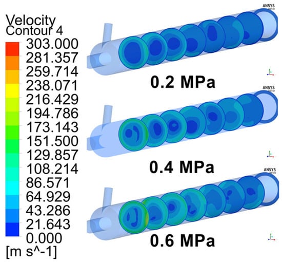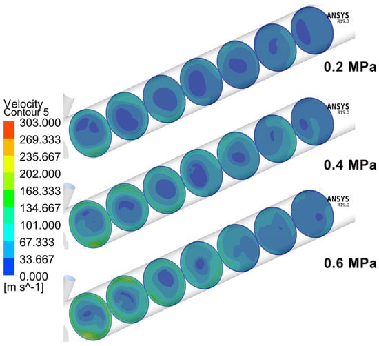 Axial velocity distribution of the swirl flow pipes at different inlet pressures.