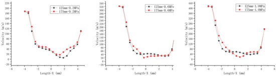The high-pressure flow passes through the inlet nozzle of the swirl flow pipe into the main tube. As the swirl flow pipe has no external source of work or heat, the pressure at the inlet is the only energy source available. The bulk of the pressure drop occurs in the nozzle, where the velocity increases dramatically, and a cyclonic flow is established. Figure 17 shows that as the swirl flow pipe inlet pressure continues to increase, the inlet radial cyclonic velocity rises, but the magnitude of the change decreases. The tangential velocity of the core flow is lower than that of the peripheral flow. It can be seen that the tangential velocity increases in the positive and negative Y-direction along the radius of the tube. The maximum velocity in the negative direction of the X-axis is greater than the maximum velocity in the positive direction, mainly because the former velocity is the velocity at the inlet of the swirl flow pipe into the vortex chamber, as shown in Figure 10. The pressure potential energy of the gas at the inlet is converted into kinetic energy, and the velocity rises sharply; this is the maximum velocity inside the swirl flow pipe. Figure 17 shows a gradual increase in tangential velocity from the center of the shaft to the outer edge of the swirl flow pipe, the low-velocity region at the center of the shaft gradually increases in the direction of the hot-end tube, indicating a gradual decrease in pressure along the hot-end tube.