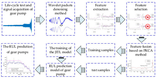The main research steps of this study are shown in Figure 1. First, the gear pump pressure signals at a pressure port were collected by a pressure sensor. After eliminating the DC component of the collected pressure signals, the wavelet packet denoising method was used to denoise the signals. After denoising, the time- and frequency-domain characteristic indices of the signals were extracted and preliminarily screened. Subsequently, the kernel PCA (KPCA) was used to analyze the screened time- and frequency-domain characteristic indices. The first and second principal components were extracted to identify the performance degradation index of a gear pump. Finally, based on the degradation index, a prediction model based on the k-vector nearest neighbor (k-VNN) JITL method was established for the RUL prediction of a gear pump. The method proposed in this paper was compared to the traditional JITL method based on k-nearest neighbor (k-NN). The results show that the proposed RUL prediction model of a gear pump has a higher prediction accuracy than the traditional method.