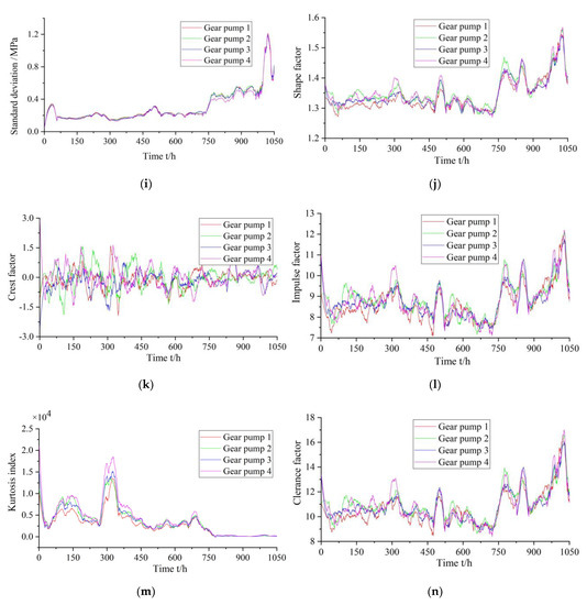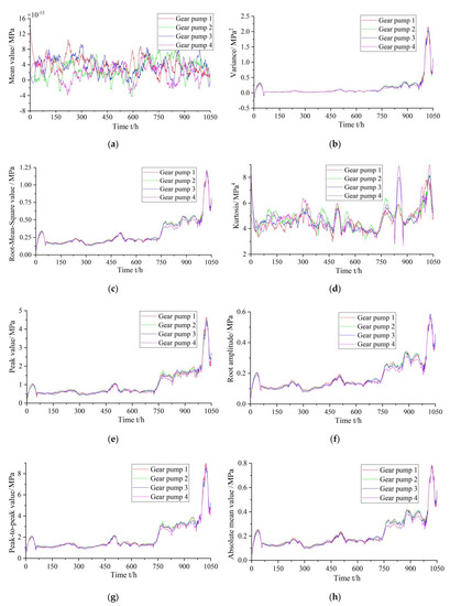 - For obtaining the gear pump performance degradation evaluation indices, the characteristic parameters of the pressure signal include variance, root-mean-square value, peak value, root amplitude, peak-to-peak value, absolute mean value, standard deviation, shape factor, clearance factor, and average power, which have good sensitivity to the performance degradation of the gear pump. Using the KPCA method can effectively avoid the data redundancy caused by the correlations among various characteristic parameters. With continuous performance degradation of the gear pumps, the evaluation indices present a clear monotonic increasing trend. Simultaneously, the evaluation indices have good sensitivity to the early failure performance of the gear pumps.