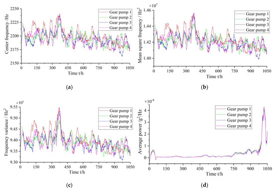 In traditional methods, as a gear pump performance degradation characteristic index, a single time- or frequency domain-characteristic index is frequently used as the basis. Owing to the variability and complexity of the gear pump operation process, a single index cannot accurately and comprehensively represent the faults and performance degradation information during its operation. Therefore, it is necessary to consider and extract multiple appropriate features to achieve comprehensive characterization of a gear pump performance degradation trend. For obtaining the performance degradation characteristic index of a gear pump, in this study, multiple characteristic parameters from the time and frequency domains are selected, including variance, root-mean-square value, peak value, root amplitude, peak-to-peak value, absolute mean value, standard deviation, shape factor, clearance factor, and average power. Subsequently, the dimensionality reduction calculation is performed for the selected multiple characteristic indicators. Finally, the characteristics after the dimensionality reduction are used as the performance degradation evaluation index of the gear pump.