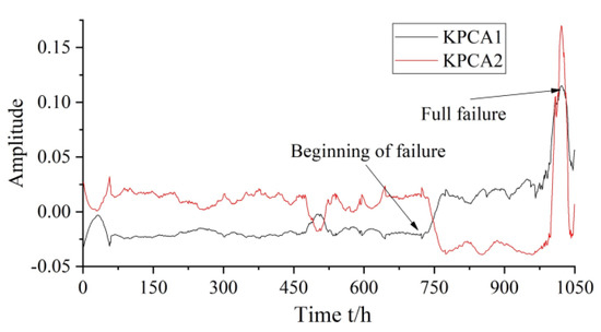 The first principal component obtained by the KPCA method shows a clear upward trend with the gear pump performance degradation. At the beginning of the failure of the gear pump (approximately 700 h), the first and second principal components present clear changes. At the full failure of the gear pump (approximately 1033 h), both first and second principal components reach their maximum values, as shown in Figure 10. Therefore, the first and second principal components can be extracted by the KPCA method to reflect the performance degradation trend of the gear pump. This method has good sensitivity to the beginning of the failure and presents a stable change trend with the performance degradation of the gear pump.