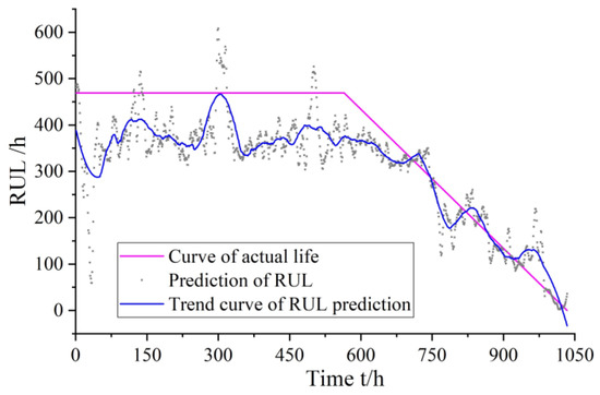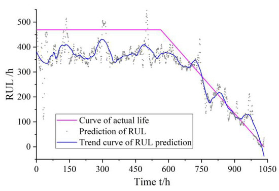 As can be seen from Figure 11, the gear pump is in a healthy state in the initial operating state without any mechanical failure; therefore, its life is not changed significantly. Over time, when the gear pump has operated for approximately 700 h, its RUL begins to decrease gradually. The predicted values of the RUL basically coincides with the real values.