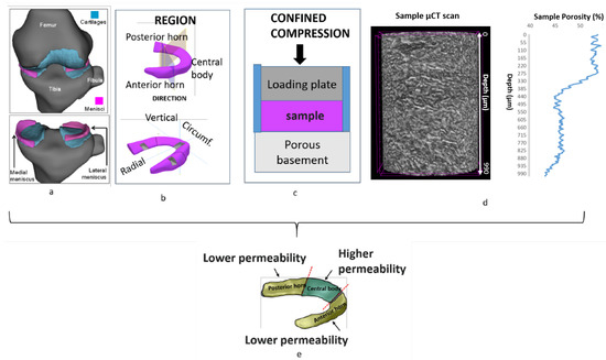 (a) Schematic representation of the knee joint; (b) the different regions of the meniscus: posterior horn, central body, anterior horn and the three directions: vertical, radial and circumferential; (c) schematic representation of the confined compression test set up, (d) example of the variability of the porosity within meniscal samples from CT scans; and (e) the results show that the central body of the meniscus exhibits higher permeability values.