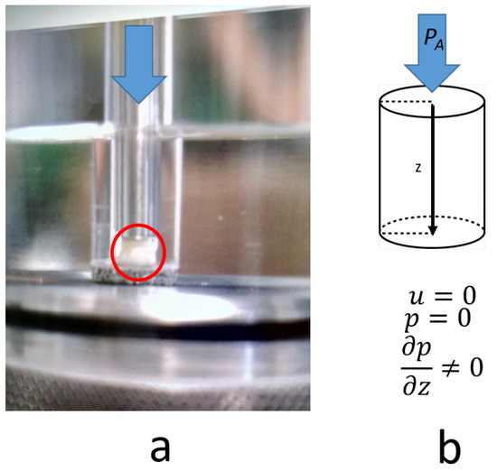 (a) The confined compression test set up. Cylindrical specimens are extracted from a human meniscus. (b) The cylinder is then confined inside a glass chamber with a porous base and compressed by a metal bar. During compression, the water in the meniscal sample flows from the base of the cylinder. (b) Schematic representation of the boundary conditions used to solve the boundary value problem.