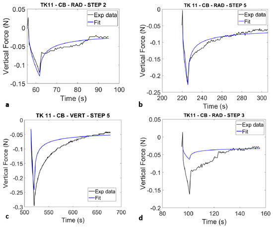 Examples of fittings of relaxation test data (only one of the five-step test is reported) with Equation (10) for a medial human meniscus (TK11)—central body (CB). (a,b,d) samples extracted in the radial direction and (c) in the vertical direction. Table 3 contains the parameters and permeability k of all the five steps.