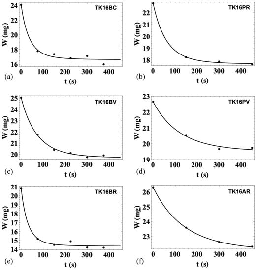 Evolution of the decrease in weight during the confined compression test, which was correlated with the amount of the fluid discharged upon compression of the tissue. The fittings relation is given in Equation (26). The graphs shown are related to samples extracted from a lateral meniscus (tk16). (a) Sample from the central body (B) and along the circumferential direction (C). (b) Sample from the posterior horn (P) and along the radial direction (R). (c) Sample from the central body (B) and along the vertical direction (V). (d) Sample from the posterior horn (P) and along the vertical direction (V). (e) Sample from the central body (B) and along the radial direction (R). (f) Sample from the anterior horn (A) and along the radial direction (R).