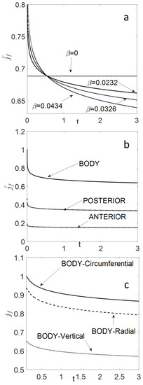 Figure 6a shows the normalized flow rate () calculated considering Equation (1) in the case of a constant value of gradient of pressure , and the three values of obtained for the central body, posterior and anterior horns, respectively. Even a small value of the time fractional derivative affects the fluid flow response. is equivalent to considering the classical Darcy law, i.e., the fluid flow rate is constant in time.