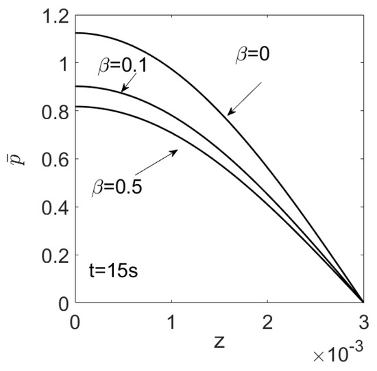 The rate at which the fluid flows and the pore pressure decrease and the solid structure deformation increases is ruled by the value of the fractional derivative . A higher value of implies a faster pore pressure diffusion and, hence, a faster solid deformation. Figure 7 shows the evolution of the adimensional pore pressure ( in Equation (21)) throughout the length of the sample along the z axis for different values of at time 15 s. It can be seen that the pore pressure drops at a faster rate with increasing .
