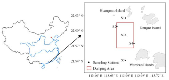 The Huangmao Island marine dumping area is near the Pearl River Estuary in the South China Sea. The dumping area began to receive dumping materials in 1986. As of 2017, this dumping area had received 6750 × 104 m3 of dredged materials. Dumping materials in the Huangmao Island marine dumping area were mainly dredged materials from wharves, harbor basins, and channels: Most were cleaning dredged materials (Class I standard for dredged materials for dumping in dumping area) [19], a small amount was contaminated dredged materials (ClassⅡ), and none were polluted dredged materials (Class Ⅲ).