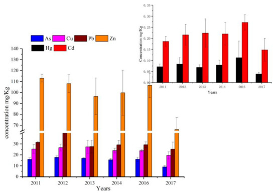 Changes in the concentrations of HMs in the surface sediments in different years are shown in Figure 2. The highest concentrations of Hg, As, Cu, Pb, Cd, and Zn were observed in 2016, 2012, 2013, 2012, 2016, and 2011, respectively. In 2017, the concentrations of all HMs were the lowest, which might be related to the significant reduction in the dumping amount in 2017. From 2011 to 2016, the concentrations of As, Cu, and Pb did not change significantly, that of Zn first decreased and then increased, and those of Hg and Cd increased. Changes in HM concentrations in sediments were affected by multiple factors, such as the pollution level of dumped dredged materials, dumping volume, and hydrodynamic characteristics of the dumping area.