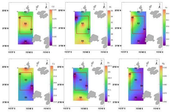 Spatial distribution profiles of the HMs in the sediments from the study area are shown in Figure 3. Concentrations of HMs in surface sediments generally showed a high trend in the north and central areas of the dumping area and a low trend in the south of the dumping area. The concentration of Cd was higher in the dumping area but lower outside the dumping area; it reached its highest value at station S3 (in the center of the dumping area) and the lowest at station S5 (in the south outside the dumping area). The concentration of Pb was higher in the central and south of the dumping area but lower in the northwest; it reached its highest value at station S3 and the lowest at station S2 (at the edge of the dumping area). The concentrations of Hg and As gradually decreased from northwest to southeast, reaching the highest at station S2 and the lowest at station S5. The concentration of Cu gradually decreased from north to south, reaching its highest at station S1 and lowest at station S4. The concentration of Zn gradually decreased from north to south in the dumping area, reaching its highest at station S5 and lowest at station S2.