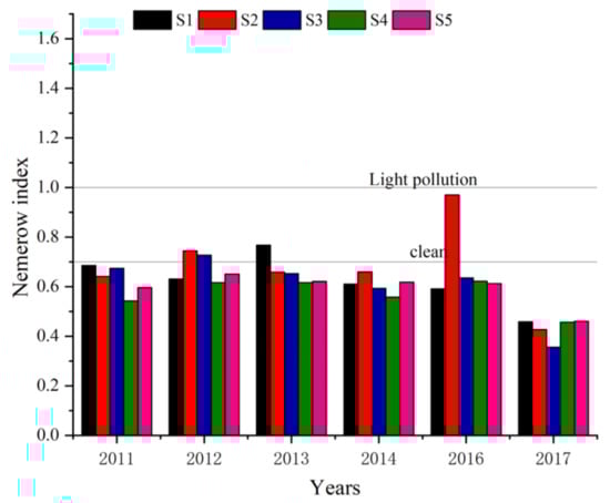 The Nemerow index was used to evaluate the pollution of HMs in the sediments in the dumping area over different years (Figure 4). In 2012, 2013, and 2016, the Nemerow index exceeded 0.7 but was less than 1. This finding indicated that the sediments in the dumping area had reached light pollution levels in 2012, 2013, and 2016. Sediments in other years were at a clean level. The pollution level in 2016 was slightly higher, which might be related to larger quantity of dumping materials in this year. According to the pollution distribution, the polluted areas were mainly in the northwest (S1 and S2) and central areas (S3) of the dumping area. Additionally, the change in water depth showed that these stations were areas with large dumping quantities, indicating that dumping might have a negative impact on sediments.
